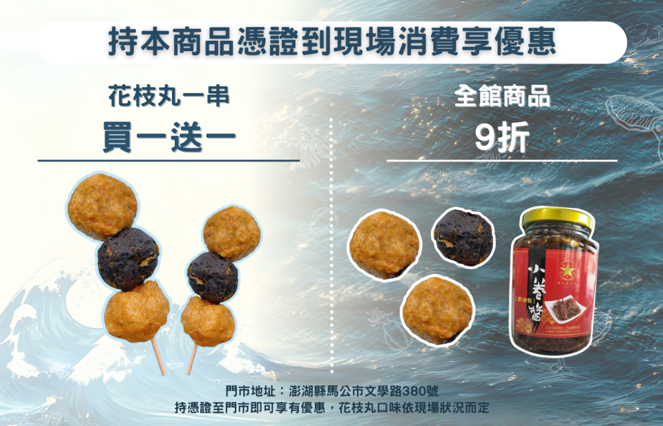 4.憑商品訂購憑證,現場兌換花枝丸。門市地址:馬公市案山里文學路380號;門市取貨時間:10:00 -17:00。