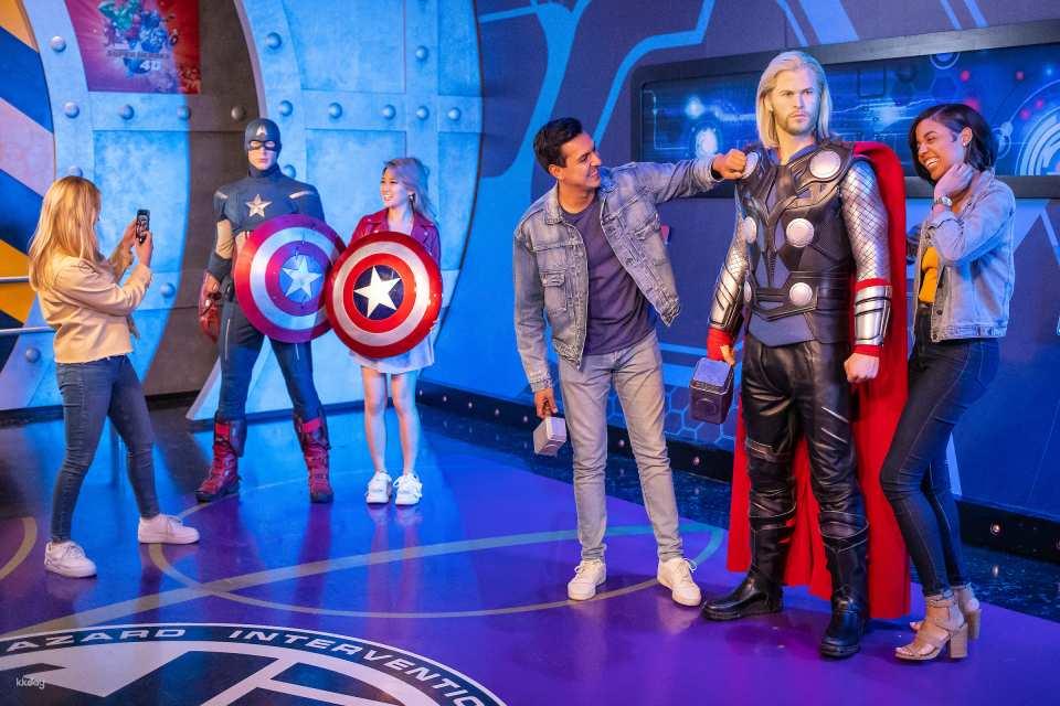 在好萊塢杜莎夫人觀賞 MARVEL Universe 4D 電影,透過震撼的感官體驗,如同親自見到驚奇隊長、雷神索爾、黑豹、火箭浣熊、蜘蛛人與蟻人等漫威裡的超級英雄。