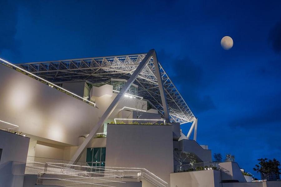 建築為日本建築師坂茂所設計,主體建築以具臺南特色鳳凰花轉化為既純粹又強烈的五角造型,再以垂直堆疊、錯位的各式方型空間,創造自由彈性的參觀動線,半戶外平臺以階梯形塑休憩與活動空間,是近年台南旅遊的熱門打卡景點。