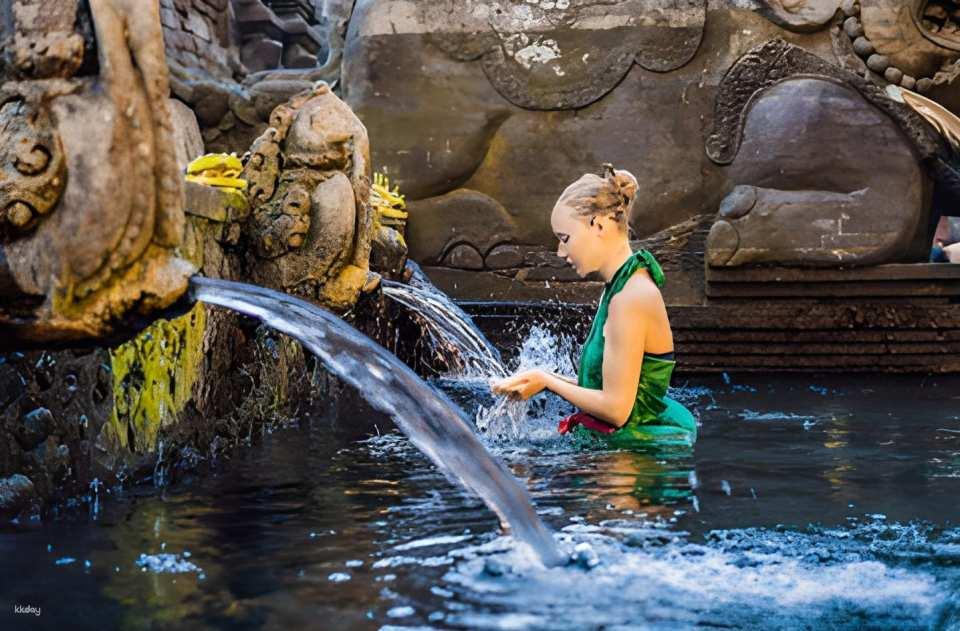 由專業且親切的司機兼導遊,前往旅客飯店接送,搭乘舒適空調車,展開私人包團一日之旅,與親朋好友一起留下難忘回憶。首先前往烏布森林中探索高達 25 公尺 Tegenungan 瀑布,在現場感受瀑布傾瀉而下的壯麗美景,讓大自然洗滌身心靈。中午時返回烏布市區,你可以自由選擇用餐地點。吃飽喝足後,前往聖泉寺(Pura Tirtha Empul),在此總共有十幾個出水口,據說每個出水口流出的泉水均有不同療效,且歷經千年,泉水仍然十分清澈,峇里島人認為沐浴在聖泉中可以消災、驅逐病痛與洗滌心靈,時至今日,當地人仍會專程前往排隊淨身沐浴,你也能一起下水體驗當地人祈福的過程。接著抵達絕美的德哥拉朗梯田(Tegallalang Rice Terrace),也是社群媒體上熱門打卡景點,欣賞遍佈壯觀、層層排列梯田,享受令人心曠神怡的峇里島自然美景,最後在當地咖啡園度過愜意午後,有機會的話也能體驗叢林盪鞦韆。