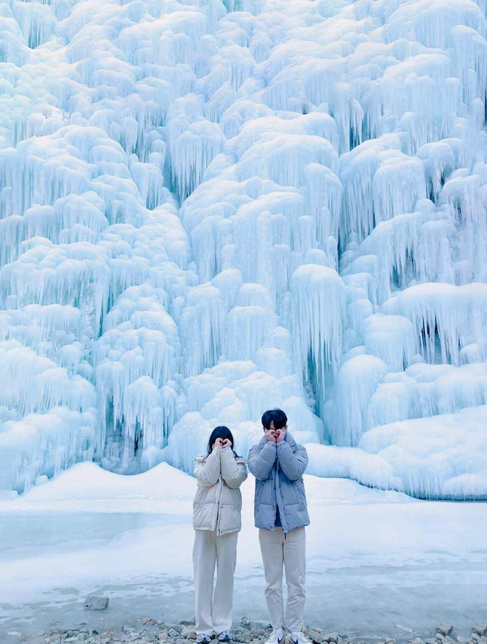 在宛如冰雪王國艾爾莎的天然冰牆前,留下美好的人生照片。