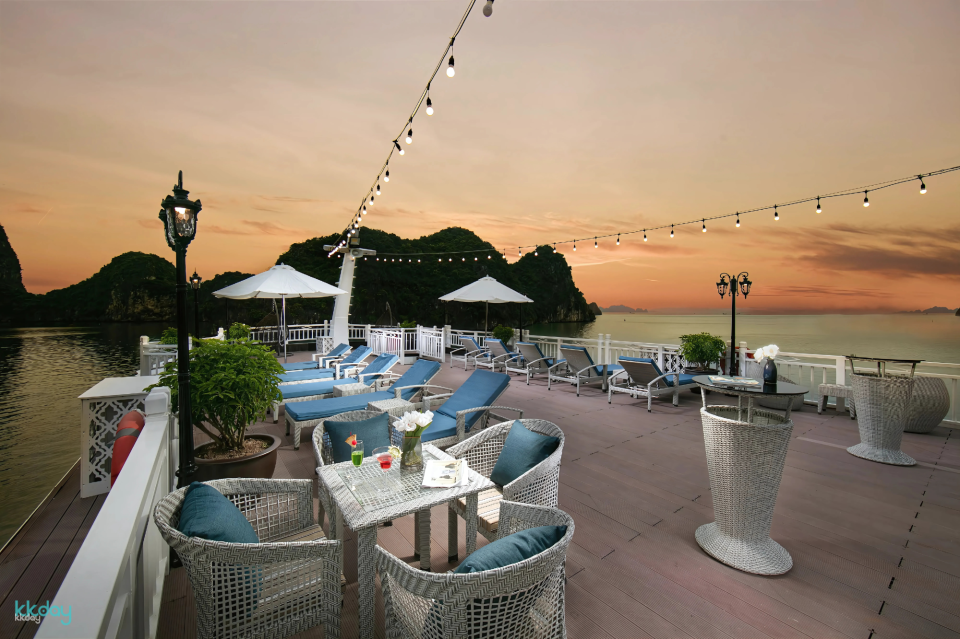 愛馬仕遊輪 (Hermes Cruise) 提供穿越下龍灣的 2 天 1 夜特別旅程,設有 18 間豪華客艙,配備私人陽台,可欣賞令人驚嘆的全景。您可以在高級餐廳享用精緻美食,在兩個室外游泳池放鬆身心,並享受專業的水療護理。寬敞的日光浴平台設有戶外酒吧,是欣賞海灣自然美景的理想場所。客人還可以參加劃橡皮艇、太極拳、烹飪課和釣魷魚等精彩活動。與愛馬仕一起旅行意味著沉浸在奢華與冒險之中,讓您的下龍灣探索之旅真正令人難忘。讓愛馬仕郵輪 (Hermes Cruise) 成為您在這趟精彩旅程中值得信賴的夥伴。