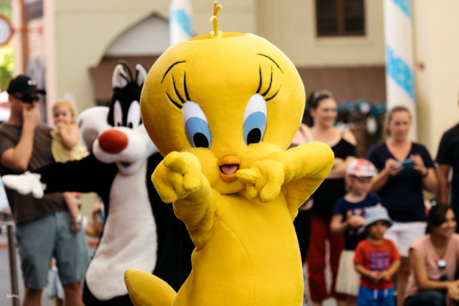 園區第一大亮點:旅客有機會在園區內巧遇受觀眾喜愛的好萊塢電影角色,包含超人、蝙蝠俠、神力女超人等 DC 漫畫裡的超級英雄,以及來自華納兄弟早期推出 Looney Tunes 系列中的卡通明星——邦尼兔、達菲鴨、崔弟與傻大貓,並與他們互動、合照留念(各角色出現時間可參考樂園時刻表或當天詢問工作人員),也別忘記參與由所有樂園明星們一同舉辦的熱鬧遊行表演。