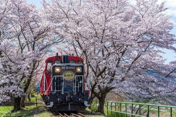 裝飾藝術風外觀的小火車從緊鄰JR嵯峨嵐山站的小火車嵯峨站出發至小火車龜岡站約25分鐘7.3公里的車程,沿途可欣賞到保津川溪谷的四季美景。