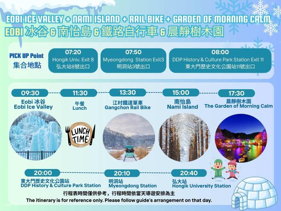 Eobi 冰谷,欣賞壯麗冰雪風光。 同時造訪韓劇取景地 南怡島,在浪漫林蔭大道散步,還能體驗趣味十足的 鐵道單車,沿途感受山林與田園美景。