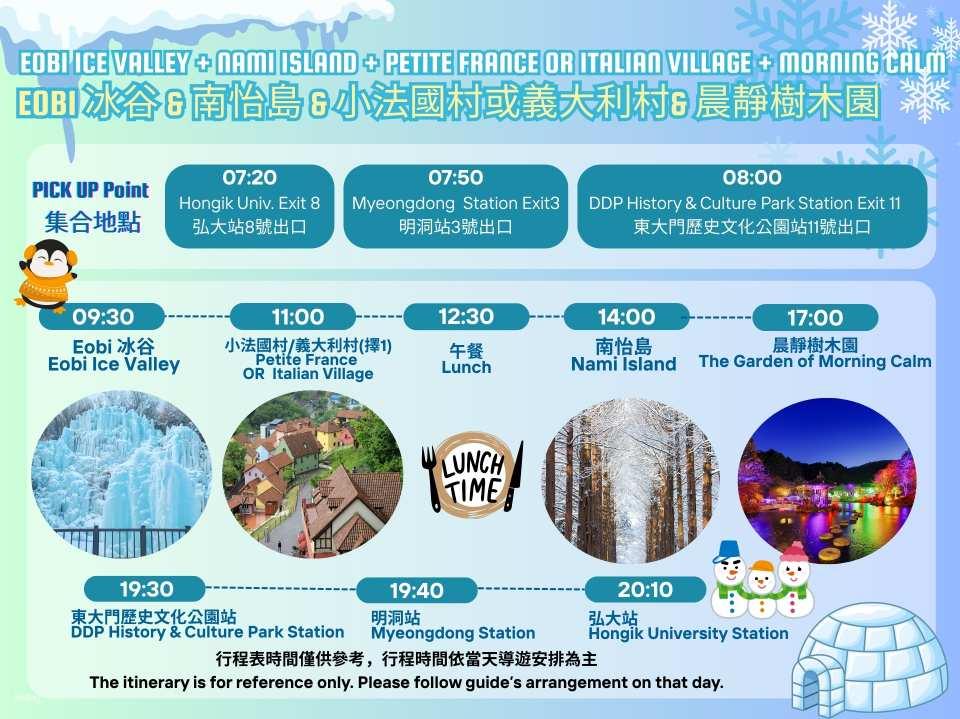 - 【方案H】Eobi 冰谷 & 南怡島 & 小法國村或義大利村& 晨靜樹木園一日遊
