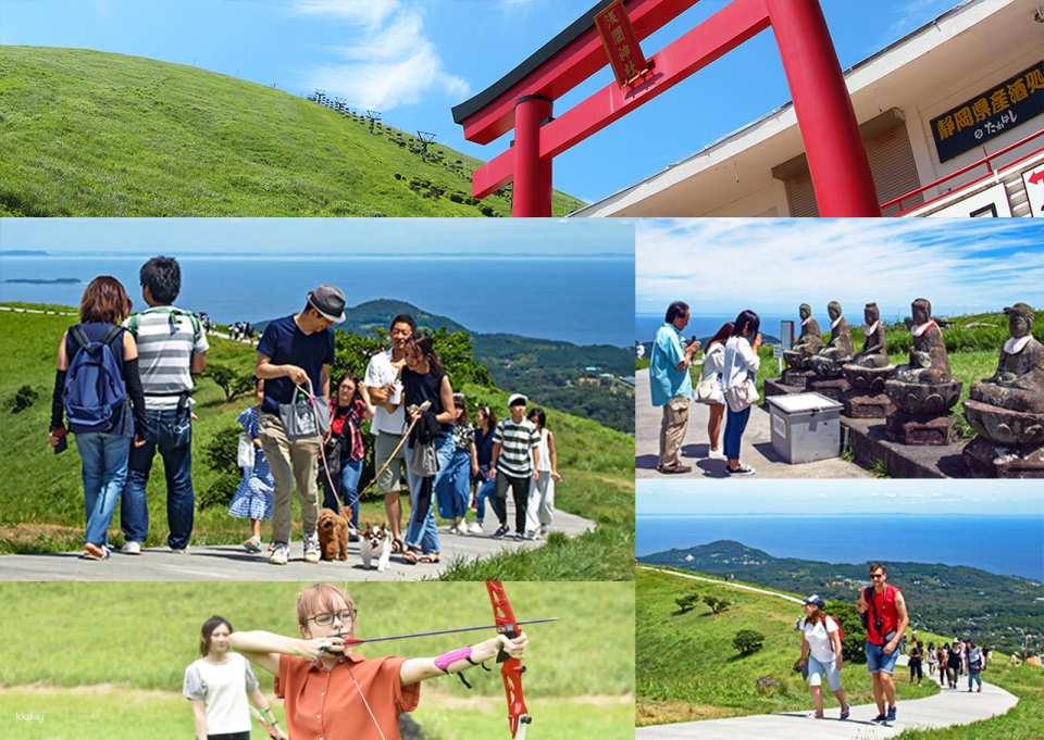 可搭乘大室山登山吊椅輕鬆登頂,僅需6分鐘即可抵達山頂。站在環形步道上,視野開闊,可360°眺望: 西望終年積雪的富士山、南看蔚藍遼闊的相模灣、北眺箱根山脈的起伏美景、東覽伊豆七島的海岸線。