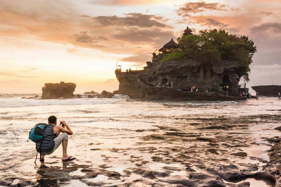 望著海神廟的日落!用相機捕捉各個美麗瞬間。海神廟獨自聳立在海中的大岩石上,是峇里島最具標誌性和最適合拍照的景點之一。親眼見證夕陽從寺廟後方落下,可以說是每位來到峇里島觀光的遊客一定要參與的行程。