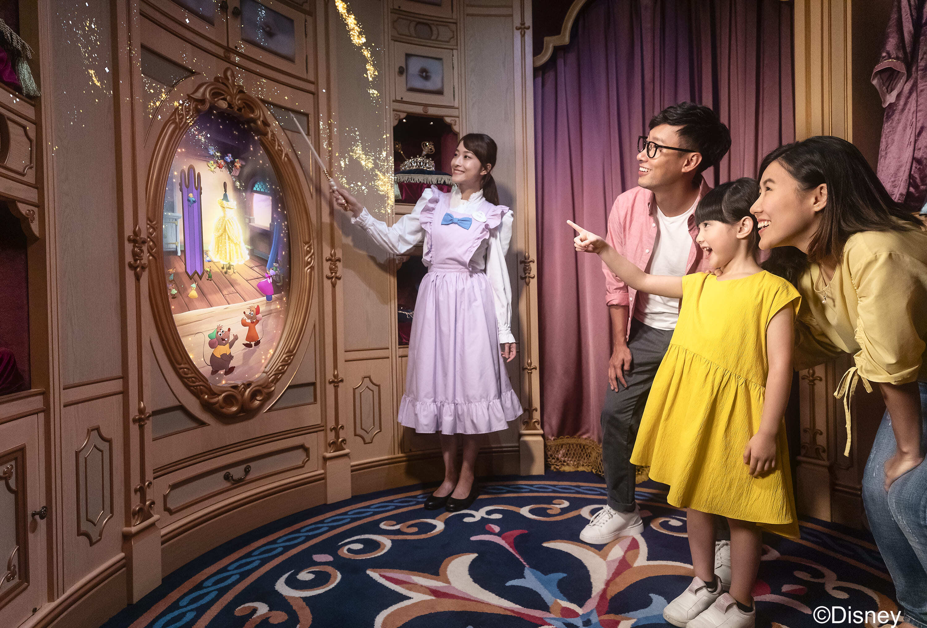 奇妙典雅的空間,美輪美奐的輝煌裝潢,盡顯皇室氣派。魔法棒一揮,魔幻衣櫥的簾幕層層打開,一套套煥然一新的豪華公主套裝及飾物陳列眼前,仙女教母實習生魔法一施,一個魅力非凡的小公主在互動魔鏡前奇妙展現。