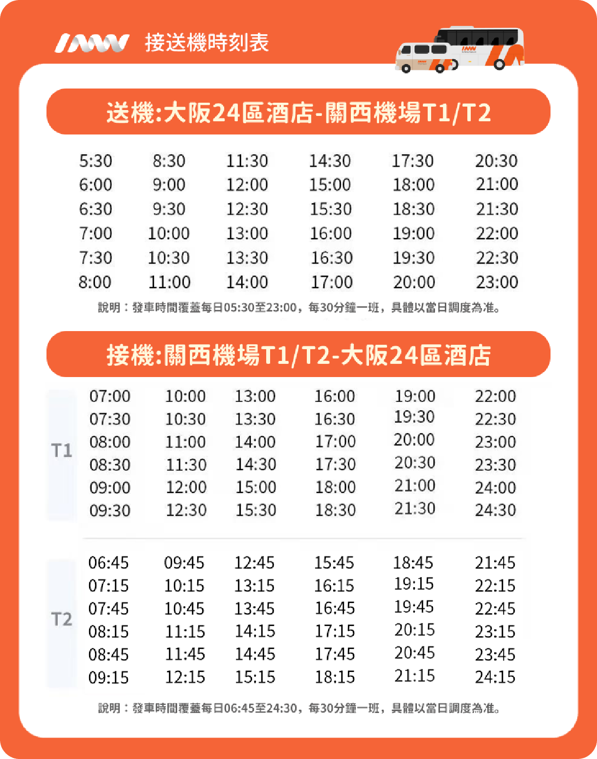 ✱轉乘的大巴為固定發車時間,每半小時發車,可參考下面時刻表。(如有異動實際依現場公告為準)
