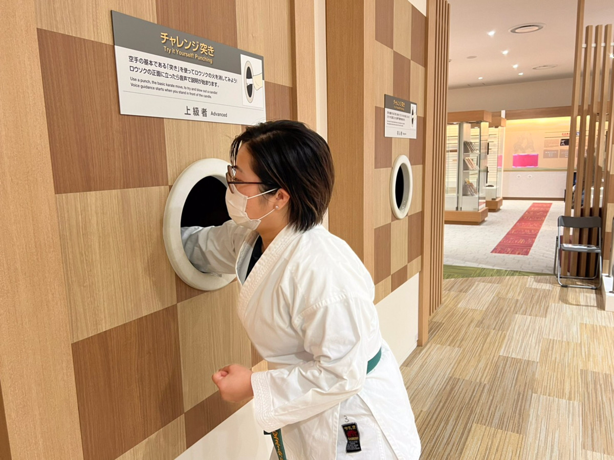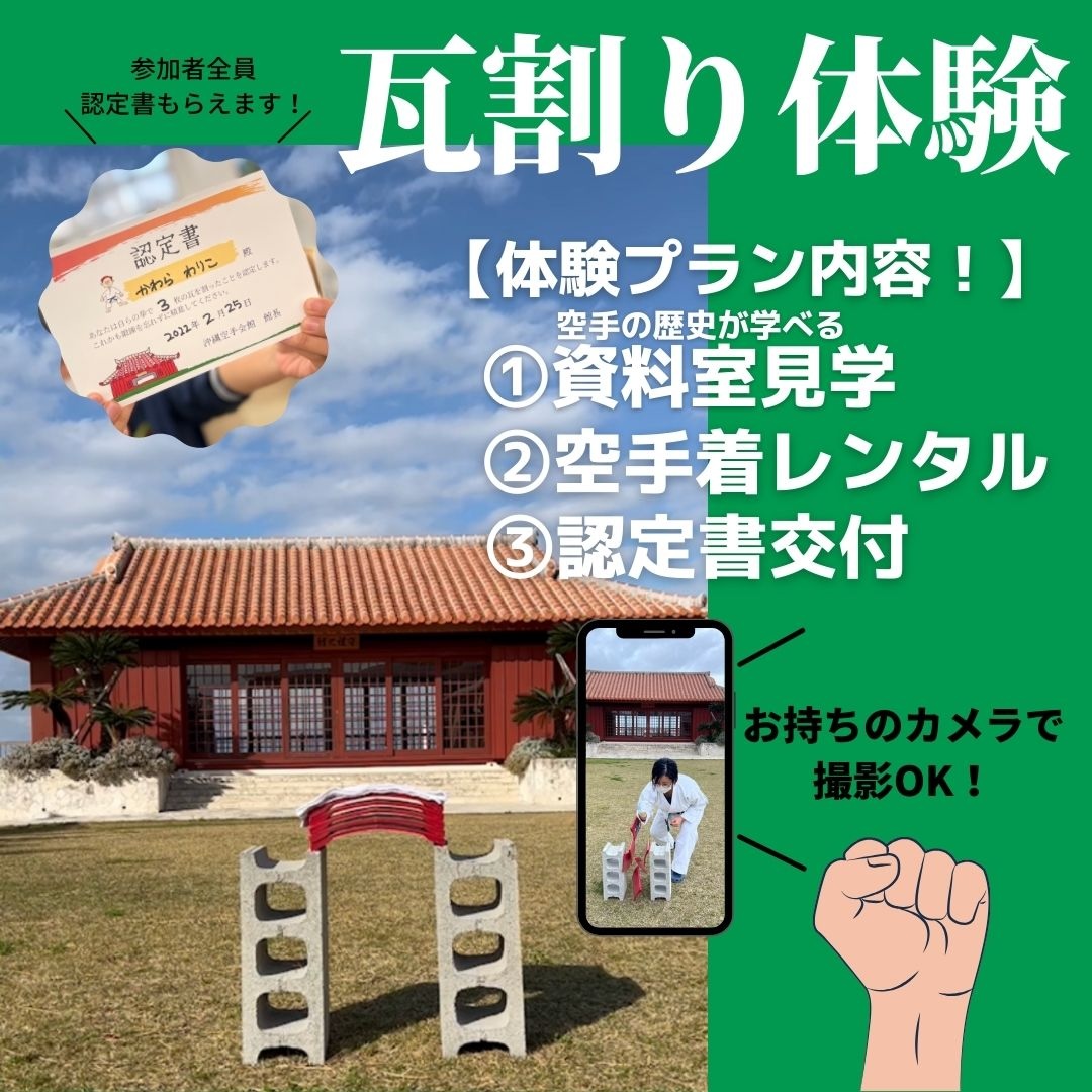 ◉行程安排:於空手道會館、展示棟的商店前集合→簽署同意書→於更衣室(免費)換穿空手道服※工作人員會協助您繫上腰帶→挑戦破瓦體驗(每人3回)→領取破瓦證明書→參觀資料室(出示證明書可免費入場)
