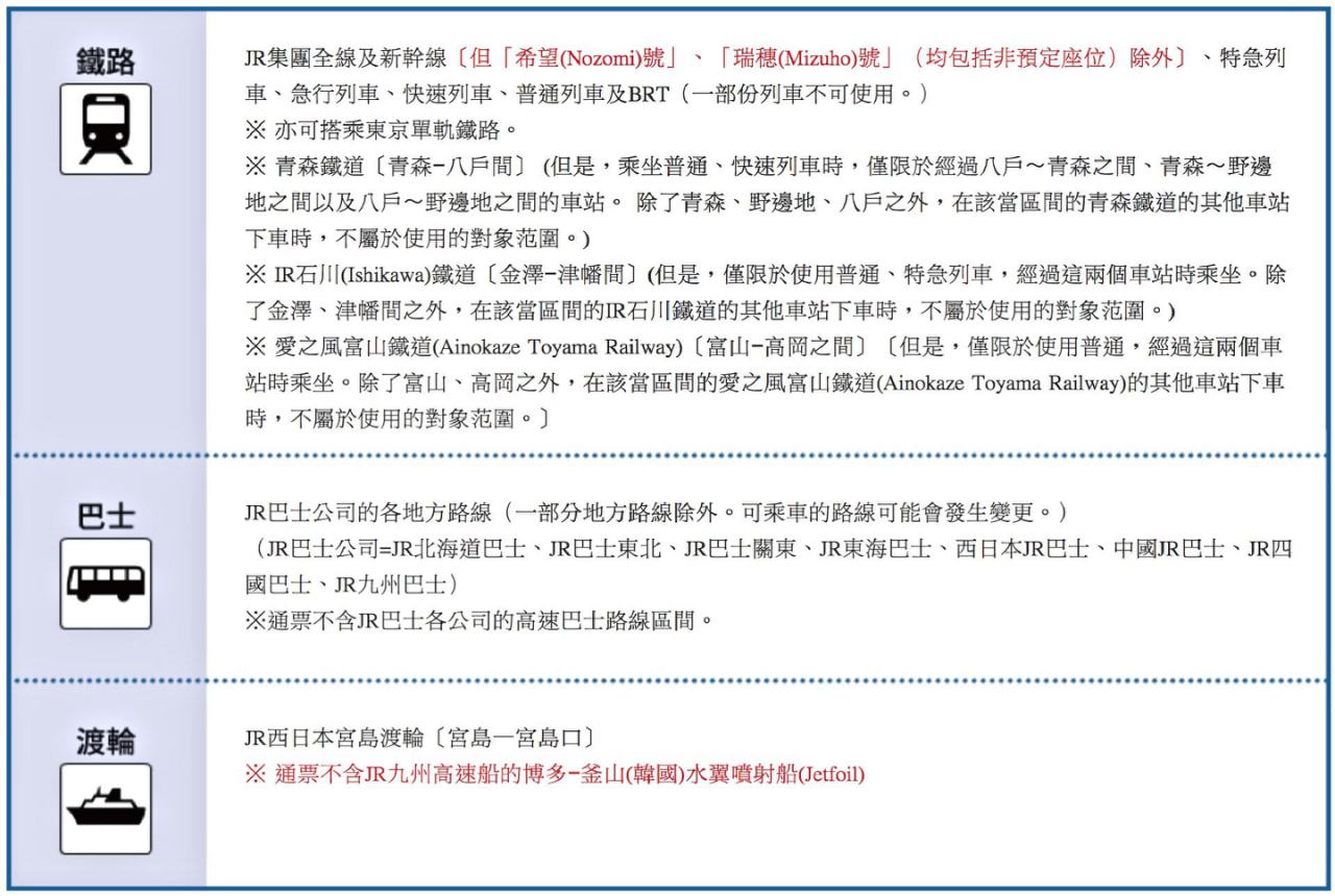1.JR集團全線及新幹線(「希望(Nozomi)」、「瑞穗(Mizuho)」(含非預定座位)除外)、特急列車、急行列車、快速列車、普通列車及BRT(一部份列車不可使用)