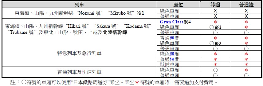※不可乘坐東海道、山陽、九州新幹線的「希望(Nozomi)」、「瑞穗(Mizuho)」的非預定座位及預定座位。