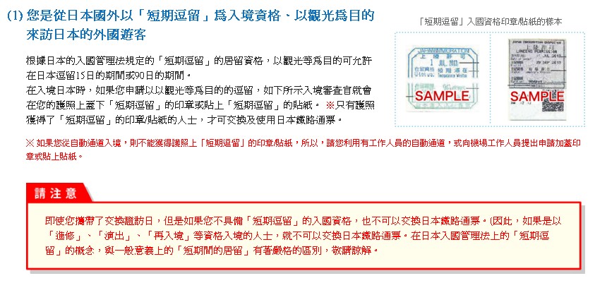 ※兌換周遊券時需出示蓋有「短期滯在」入境審查章戳或貼紙的護照。