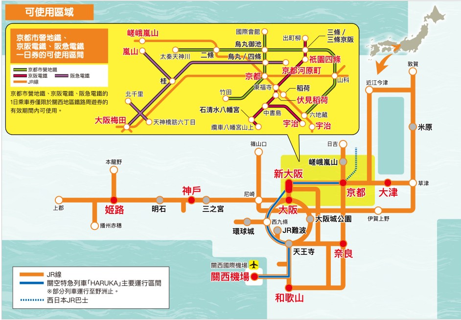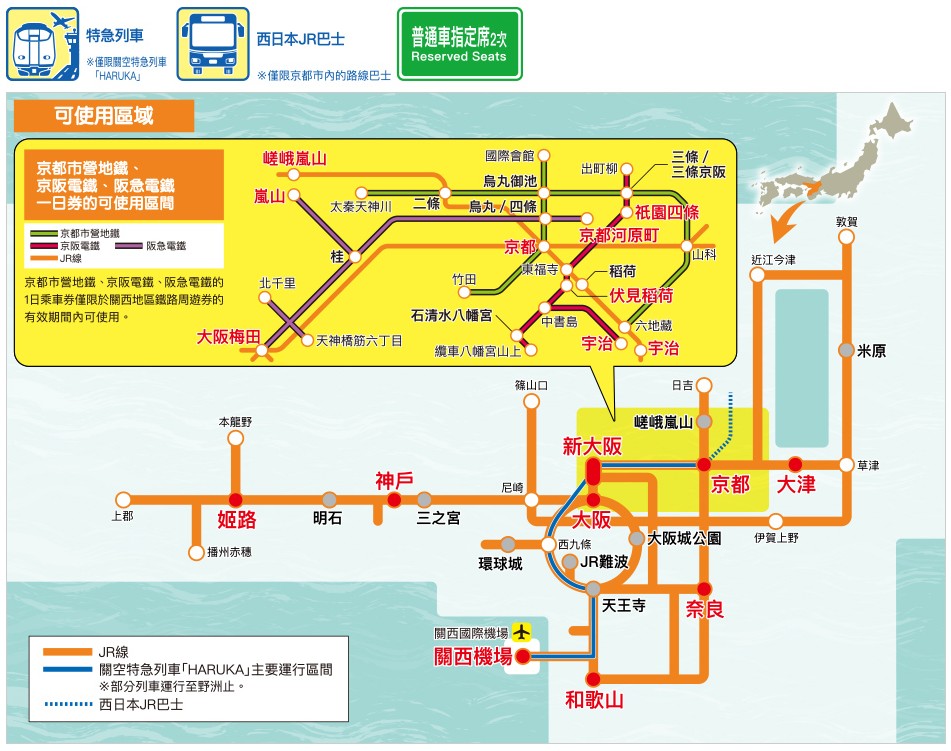 ● 可在指定區域無限乘坐,到達大阪、京都、神戶、姬路、奈良等地區。